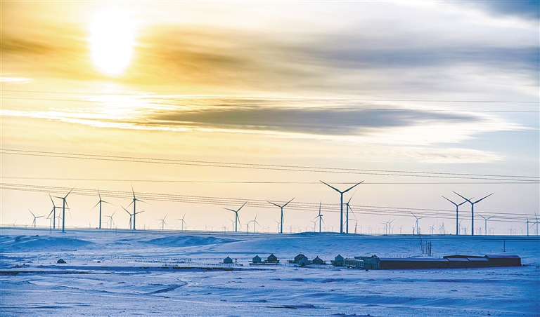 湛藍天幕之下,150座白色風(fēng)車如鋼鐵巨人般巍然矗立,巨大的風(fēng)機葉片迎風(fēng)轉(zhuǎn)動,劃破長風(fēng),發(fā)出低沉而均勻的呼嘯,與天地間的遼闊寂靜共鳴。