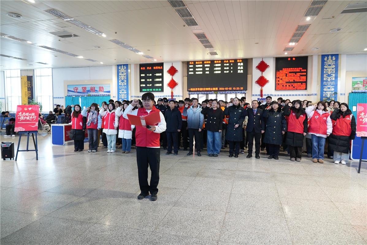 “阿姨您慢點,檢票口在二樓,行李我來幫您拎?!?9歲的杜鐵毅快步上前,穩(wěn)穩(wěn)接過老年旅客手中沉甸甸的編織袋。連日值守讓他的聲音帶著一絲忙碌后的沙啞,眼里的熱忱卻絲毫未減。作為興安盟向陽環(huán)保青年志愿者協(xié)會會長,這個春節(jié),他和志愿者們幾乎天天“泡”在車站,從進(jìn)站引導(dǎo)、行李搬運(yùn)到車次咨詢、換乘指引,用周到細(xì)致的服務(wù),為奔波的歸途人送上新春里最真切的暖意。