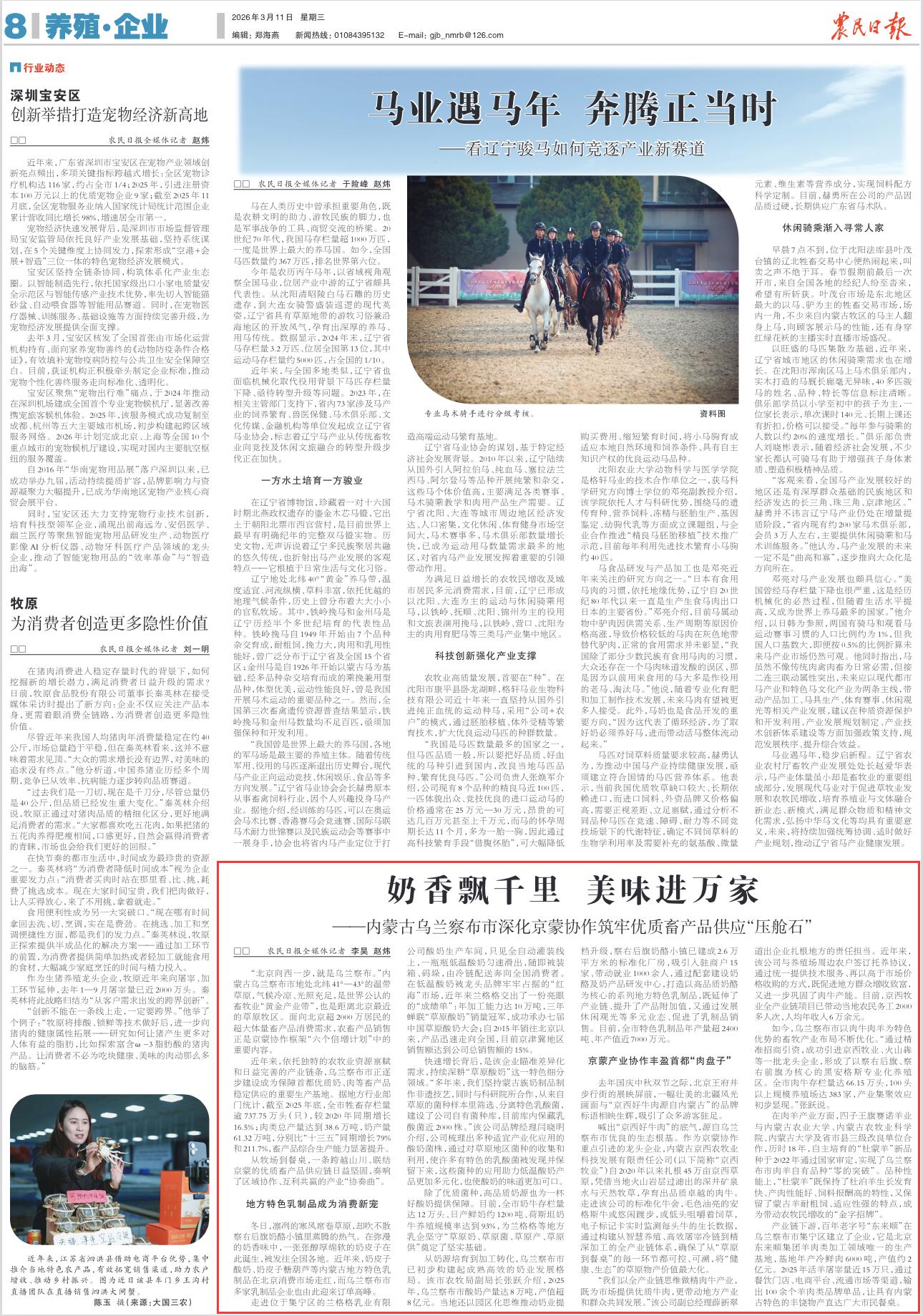 2026年3月11日,《農(nóng)民日?qǐng)?bào)》第8版刊發(fā)題為《奶香飄千里 美味進(jìn)萬家——內(nèi)蒙古烏蘭察布市深化京蒙協(xié)作筑牢優(yōu)質(zhì)畜產(chǎn)品供應(yīng)“壓艙石”》的文章,報(bào)道了內(nèi)蒙古烏蘭察布市是世界公認(rèn)的畜牧業(yè)“黃金產(chǎn)業(yè)帶”,也是距離北京最近的草原牧區(qū),面向北京超2000萬居民的超大體量畜產(chǎn)品消費(fèi)需求,農(nóng)畜產(chǎn)品銷售正是京蒙協(xié)作框架“六個(gè)倍增計(jì)劃”中的重要內(nèi)容。