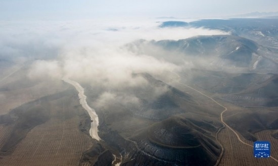 當日,寧夏吳忠市同心縣的山谷間出現(xiàn)云海景觀,農田、旱塬、公路在霧中若隱若現(xiàn),景色壯美。