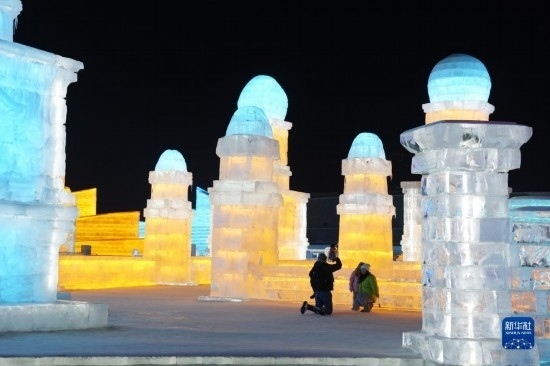 2月25日,游客在哈爾濱冰雪大世界園區(qū)拍照。