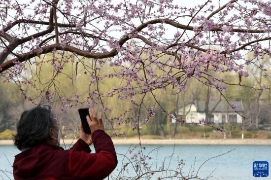 3月8日,一名游客在北京玉淵潭公園拍攝盛開(kāi)的山桃花。