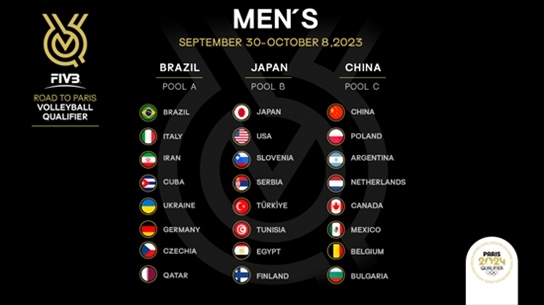 男排資格賽將于2023年9月30日至10月8日分別在中國(guó)、日本和巴西舉行,分組抽簽規(guī)則與女排相同。經(jīng)過(guò)抽簽,A組球隊(duì)分別是巴西、意大利、伊朗、古巴、烏克蘭、德國(guó)、捷克、卡塔爾;B組為日本、美國(guó)、斯洛文尼亞、塞爾維亞、土耳其、突尼斯、埃及、芬蘭;中國(guó)與波蘭、阿根廷、荷蘭、加拿大、墨西哥、比利時(shí)和保加利亞分在C組。