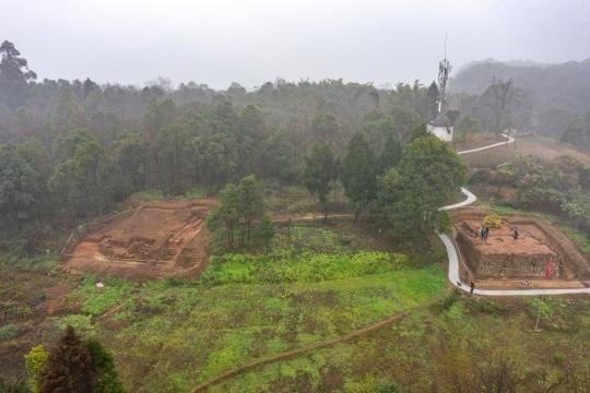 這是2月9日在重慶合川釣魚城遺址拍攝的新發(fā)掘出的類似闕臺建筑的基址(無人機(jī)照片)。新華社記者 黃偉 攝