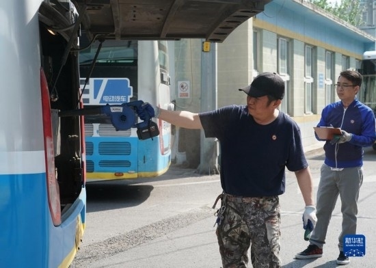 5月1日,在位于北京市朝陽區(qū)的柳芳公交場站,技術員王陸斌對車輪測溫。