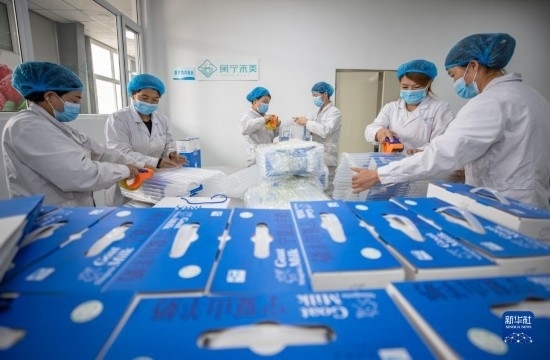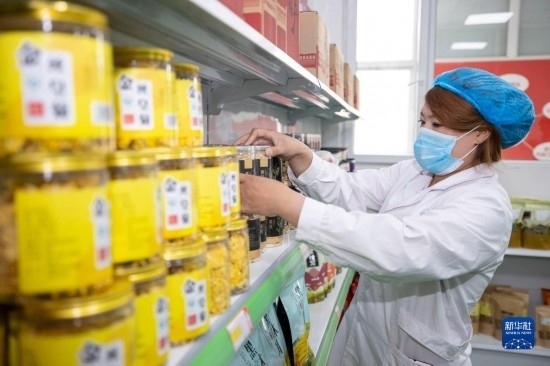 5月1日,在寧夏銀川市永寧縣閩寧鎮(zhèn)禾美電商車間,工作人員在打包產品。