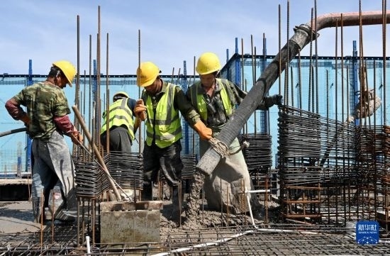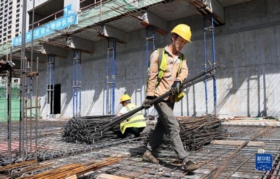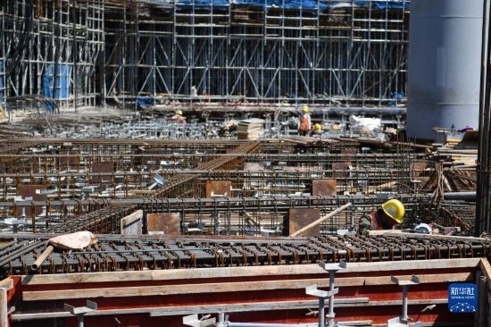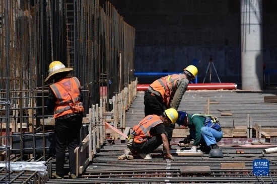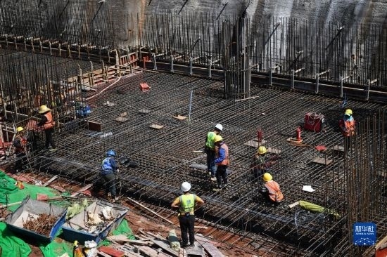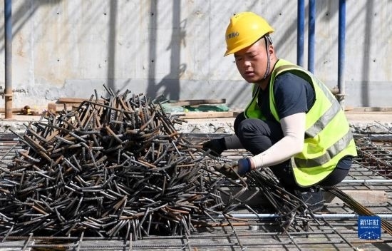 5月1日,在浙江省杭州市臨平區(qū)一個項目工地,中建三局的建設者在施工中。