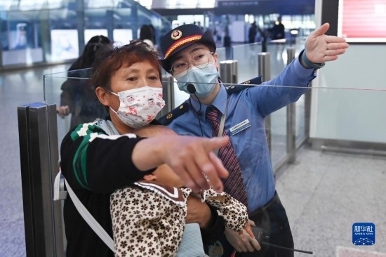 5月1日,在杭州東站候車大廳,客運員陳思悅引導旅客前往檢票口。