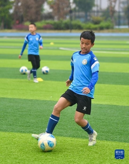在瀘州天立春雨學(xué)校足球場(chǎng),來(lái)自涼山彝族自治州的楊坤在進(jìn)行訓(xùn)練(3月29日攝)。