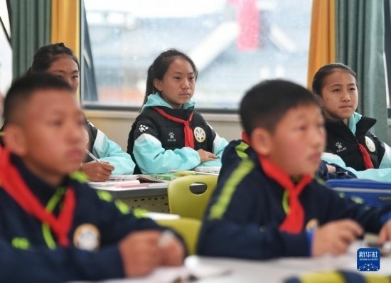 在海南瓊中縣舉辦的中國(guó)足協(xié)女足青訓(xùn)中心“希望杯”U12組比賽的空閑時(shí)段,來(lái)自涼山彝族自治州的四川隊(duì)隊(duì)員舍布么扯鳩莫(左二)和隊(duì)友們?cè)诶蠋煄ьI(lǐng)下學(xué)習(xí)文化課(4月10日攝)。