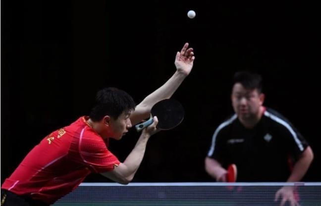 馬龍(左)在比賽中發(fā)球。