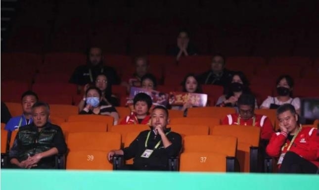 劉國(guó)梁(中)在場(chǎng)下觀賽。