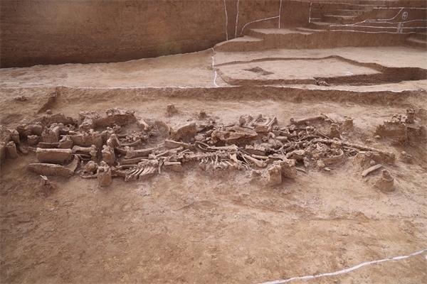 在“郭城”東南拐角處,發(fā)現(xiàn)一條殷墟時期的大型祭祀溝,長達(dá)19.36米,溝內(nèi)堆疊了3層人骨及動物骨骼,初步清理出完整的人骨3具,以及肢解的牛骨、豬骨、馬骨、鳥骨等,經(jīng)動物考古學(xué)家辨認(rèn)至少分屬17個動物個體。考古勘探還發(fā)現(xiàn)不同時期的道路遺跡穿過城壕,為探討洹北商城內(nèi)外部交通路網(wǎng)提供了重要線索。