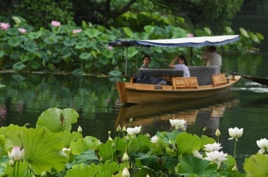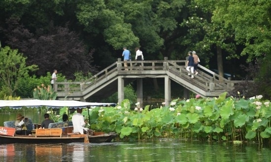 6月11日,游客在曲院風荷景區(qū)乘船欣賞荷花。
