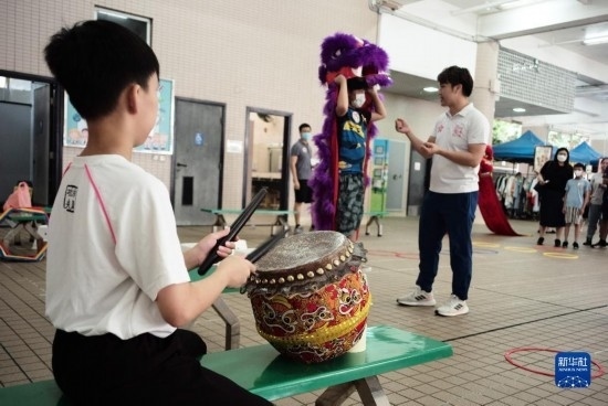 在香港漢華中學(xué),小朋友體驗(yàn)舞獅表演(6月18日攝)。