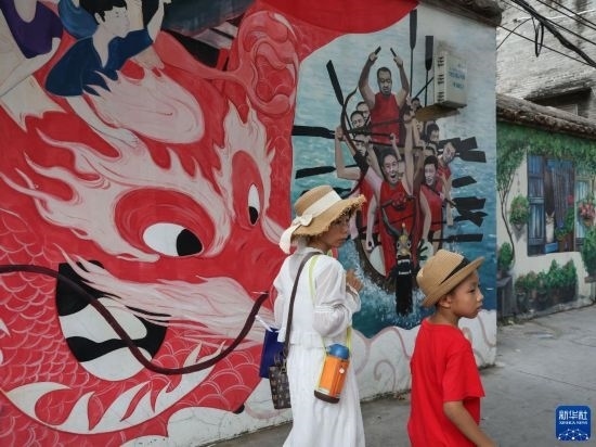 6月22日,游人經(jīng)過佛山疊滘東勝村一面龍船彩繪墻壁。