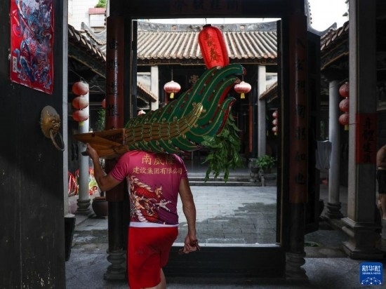 6月22日,佛山疊滘端午龍船漂移賽結(jié)束后,“扒仔”(槳手)將龍船的龍頭龍尾請回家族祠堂保管。