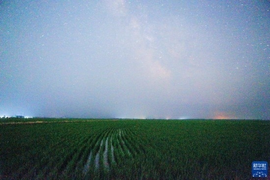 這是6月25日夜晚在黑龍江省富錦市萬畝水稻公園內(nèi)拍攝的稻田和星空(長時(shí)間曝光)。