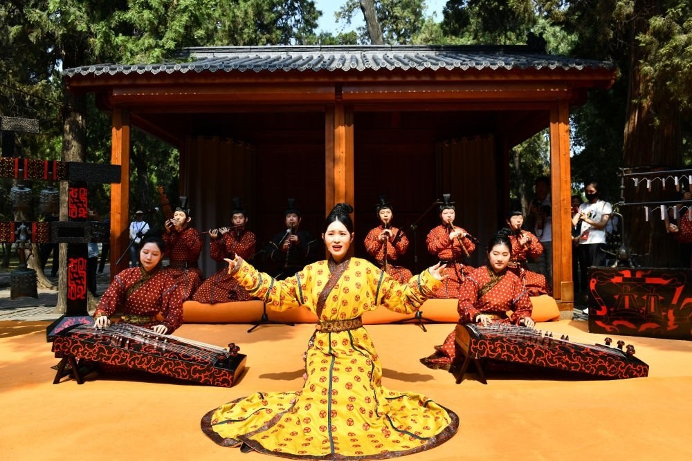 2023年6月27日,在曲阜孔廟,孔子博物館禮樂傳習(xí)所的工作人員進(jìn)行以《詩經(jīng)》為主題的雅樂表演。新華社記者 郭緒雷 攝