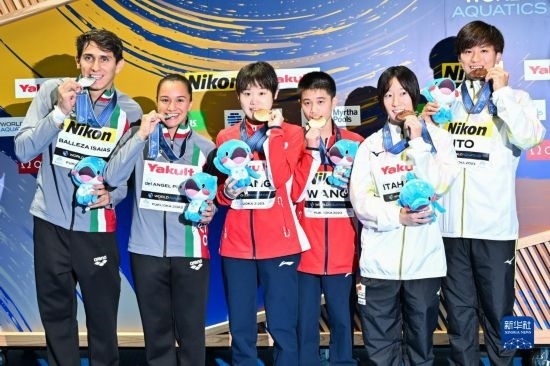 7月15日,冠軍中國組合王飛龍(右三)/張家齊(左三),亞軍墨西哥組合伊薩亞斯(左一)/佩尼切(左二)和季軍日本組合伊藤?zèng)草x(右一)/板橋美波在頒獎(jiǎng)儀式上合影。新華社記者 張笑宇 攝