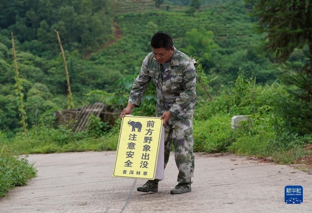 一名監(jiān)測員在野象活動區(qū)域一處道路上設置警示牌(7月19日攝)。