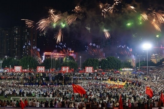 這是7月29日拍攝的“村超”比賽結束后的焰火表演。新華社記者 劉續(xù) 攝