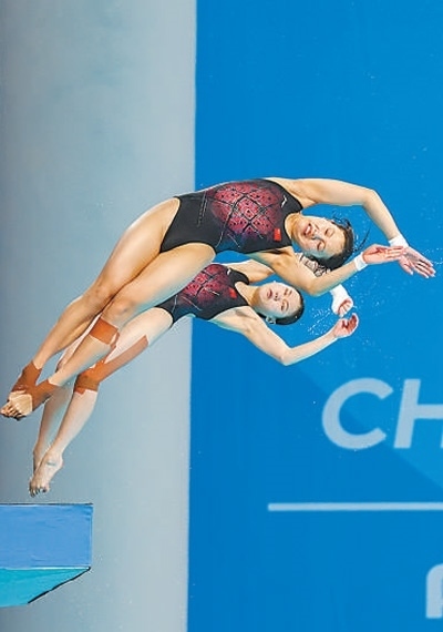 7月31日,中國代表團(tuán)選手張家齊(后)、掌敏潔在女子雙人10米跳臺決賽中。本報記者 伊 霄攝