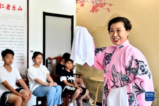 8月9日,在棗莊市市中區(qū)龍山路街道辛莊社區(qū),棗莊市藝術(shù)劇院柳琴戲市級(jí)非遺傳承人郭曉玲在為孩子們表演柳琴戲。