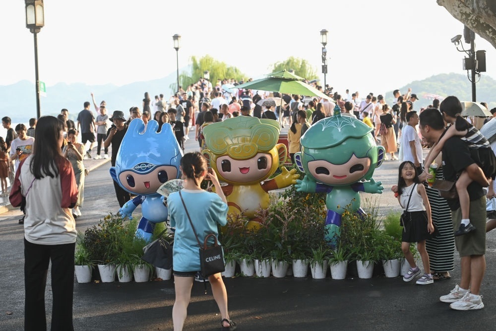 游客在位于杭州西湖景區(qū)的斷橋邊與杭州亞運(yùn)會(huì)吉祥物合影(2023年8月21日攝)。新華社記者 黃宗治 攝