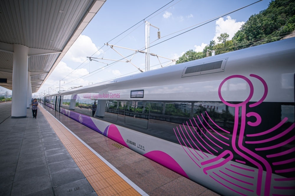 這是亞運(yùn)智能動(dòng)車組停靠在德清站站臺(tái)(2023年8月4日攝)。新華社記者 江漢 攝