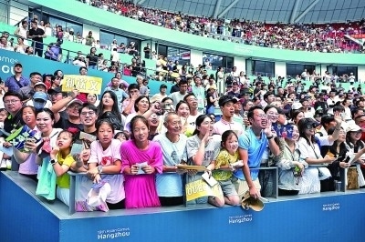 9月29日,杭州亞運會網球女子單打決賽現場,觀眾在歡呼。本報記者陳城攝 光明圖片