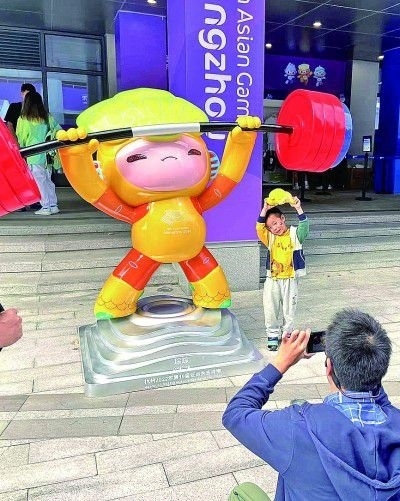 10月5日,亞運會舉重場館外,觀眾爭相與吉祥物合影,一位小朋友特意擺出與吉祥物“琮琮”一樣的舉重姿勢合影留念。本報記者 楊震攝/光明圖片