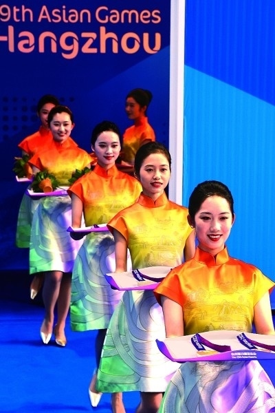 9月30日,亞運會跳水項目頒獎儀式上,禮儀人員手托裝有獎牌的托盤,面帶笑容走向頒獎臺。本報記者 楊震攝/光明圖片