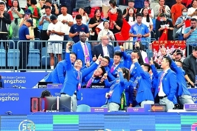 10月5日,女籃決賽后,技術官員在自拍合影。 本報記者 陳茵攝/光明圖片