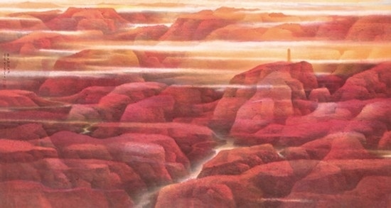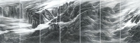 來(lái)自上海并深受海派畫學(xué)影響的樂震文、張弛,在宋元及明清山水畫學(xué)上打下了深厚的功底,也因此,他們的傳統(tǒng)山水畫深受日本民眾的歡迎。他們?cè)尉訓(xùn)|瀛多年,轉(zhuǎn)道再度研習(xí)了中國(guó)傳統(tǒng)文人畫。但真正改變他們畫風(fēng)的,卻是他們對(duì)中國(guó)北方大山大水的寫生攬勝。他們鐘情于英雄的太行山,忘情于革命勝地陜北高原,力求通過壯闊雄渾的山巒、連綿逶迤的群峰來(lái)表達(dá)他們的時(shí)代感悟,營(yíng)構(gòu)儲(chǔ)存于他們胸中的山川氣象。所謂“山河回聲”,正是這些作品抒發(fā)的中華民族歷經(jīng)歲月風(fēng)華在大好河山之中回響的奮斗激情。