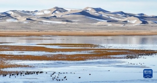 10月18日,在阿爾金山國家級自然保護區(qū),針尾鴨等水鳥在依協(xié)克帕提湖棲息(無人機照片)。