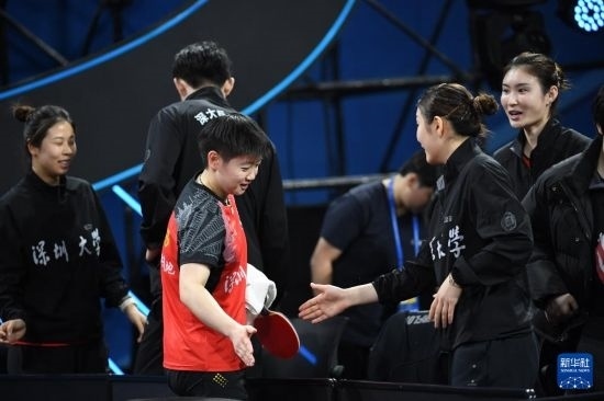 12月22日,深圳大學(xué)隊選手孫穎莎(左三)在女團半決賽獲勝后與隊友陳夢(右二)擊掌。她以3比0戰(zhàn)勝華東理工大學(xué)隊選手趙尚。最終深圳大學(xué)隊以總比分3比1戰(zhàn)勝華東理工大學(xué)隊。新華社記者 梁旭 攝