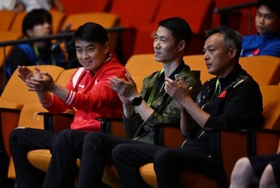 2023年5月26日,中國乒乓球協(xié)會副主席王勵勤(中)在南非德班進(jìn)行的2023年世界乒乓球錦標(biāo)賽男子單打四分之一決賽中觀戰(zhàn)。新華社記者 陶希夷 攝