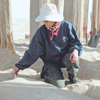 胡興軍展示了一張工作照,照片中的兩位考古隊(duì)員灰頭土臉,在烽燧旁“篩沙子”?!翱藖喛藥於伎朔殪葜谐鐾恋奈奈铮蠖嗑褪沁@樣‘篩’出來的?!焙d軍說。