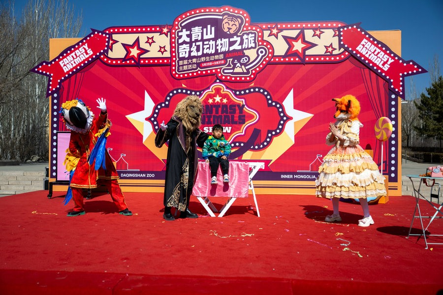 3月22日上午,在內(nèi)蒙古呼和浩特大青山野生動(dòng)物園里,5只動(dòng)物人偶正在為23日舉行的國(guó)內(nèi)大型動(dòng)物主題互動(dòng)巡游偶劇《奇幻動(dòng)物城》彩排。