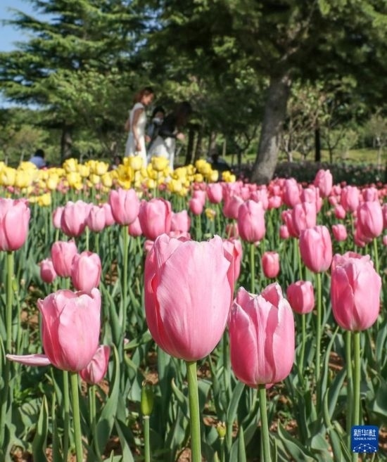 5月11日,游客在大連英歌石植物園游覽拍照。