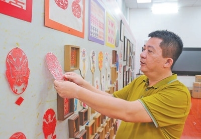 周繼川將學(xué)生的瓊劇剪紙作品張貼在展覽室。本報(bào)記者 曹文軒攝
