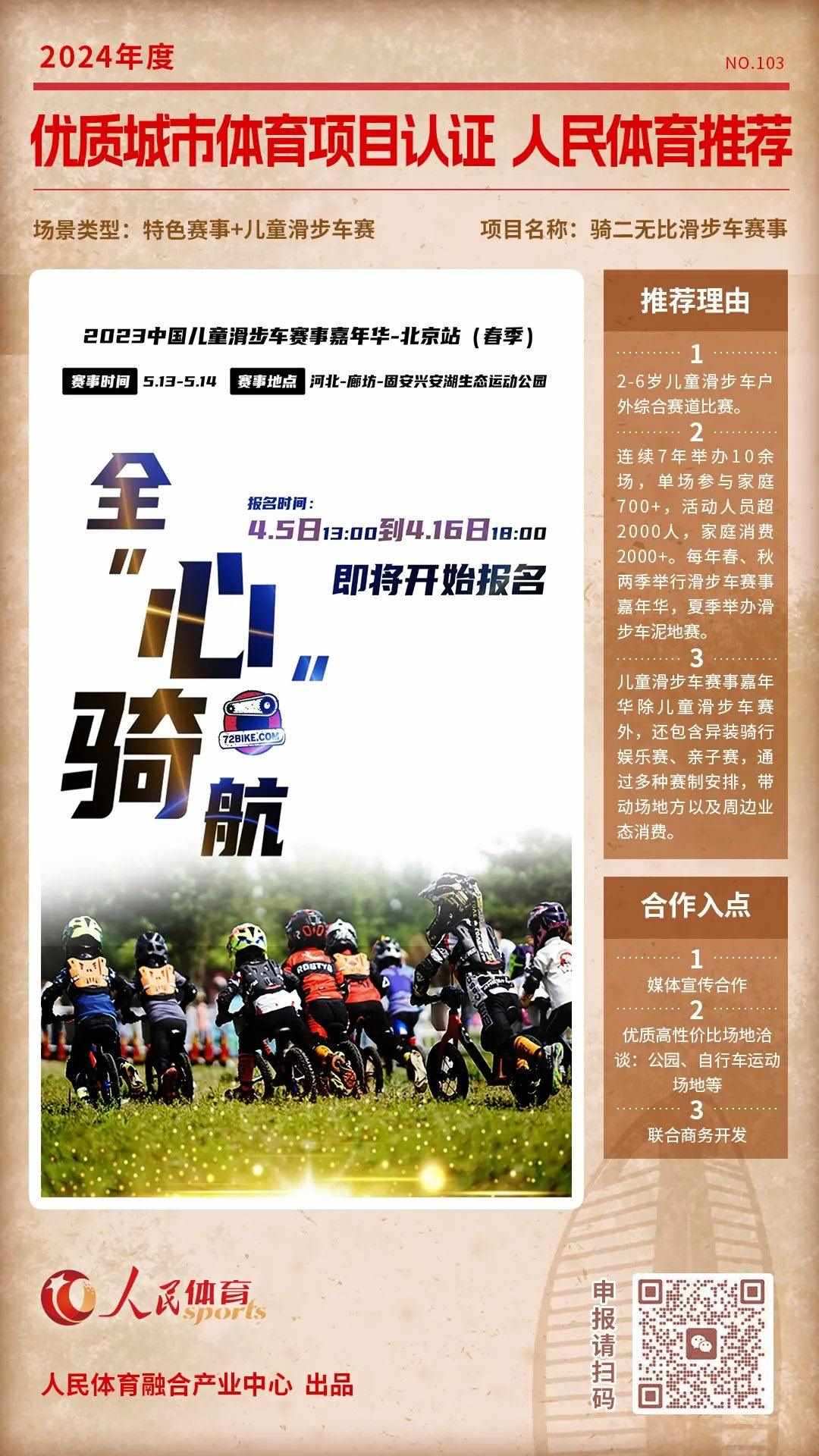 “優(yōu)質(zhì)體育賽事及活動認(rèn)證推薦計劃”是人民體育“城市體育產(chǎn)業(yè)高質(zhì)量發(fā)展計劃”的重要組成部分,人民體育一直致力于攜手權(quán)威機構(gòu)、組織單位等聯(lián)合推薦優(yōu)質(zhì)項目,項目類型包括且不限于賽事、活動,也涵蓋產(chǎn)品與服務(wù)類別。旨在以更客觀的角度,展示在體育產(chǎn)業(yè)發(fā)展中有所創(chuàng)新,有所價值的項目,促進(jìn)多方相互了解,融合發(fā)展。