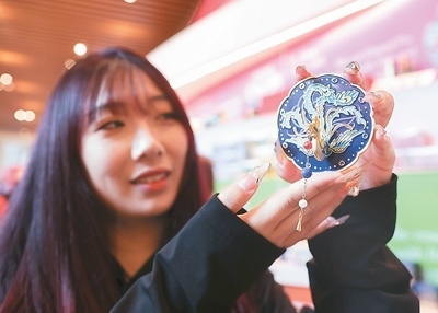 觀眾在中國(guó)國(guó)家博物館展示文創(chuàng)產(chǎn)品——鳳冠化妝鏡。陳曉根攝(人民視覺)