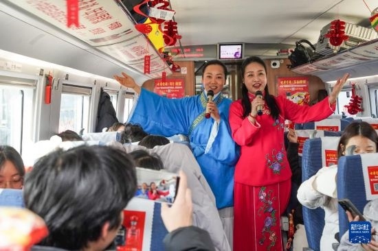 春運(yùn)前夕,中國鐵路上海局集團(tuán)有限公司合肥客運(yùn)段組織由鐵路職工組成的非遺表演小分隊登上C3685次旅客列車,為車廂內(nèi)的旅客帶來“廬州蛋雕”和黃梅戲表演等,并為旅客送上祝福。