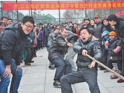 白沙村村民在村全民健身運動會上進(jìn)行拔河比賽。