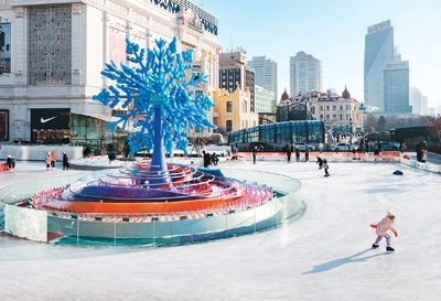 在哈爾濱市南崗區(qū)一處公益冰場,人們在“冰雪之冠”雕塑旁滑冰。