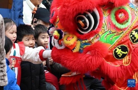 1月19日,小朋友在社區(qū)廟會(huì)上和舞獅互動(dòng)。