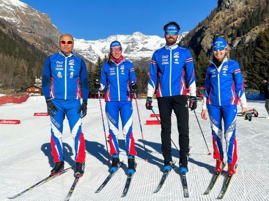 2022年1月24日,泰國越野滑雪隊運動員卡倫·尚?。ㄗ蠖?、馬克·尚?。ㄗ笕┡c父母在歐洲備戰(zhàn)訓練時合影。新華社發(fā)(受訪者供圖)