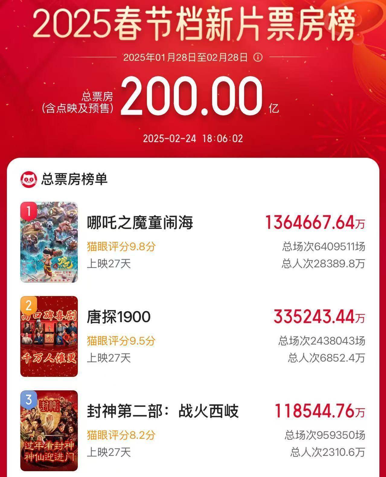 2025春節(jié)檔上映新片總票房(含預售)